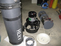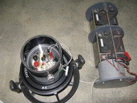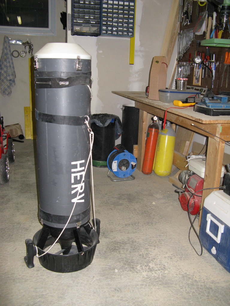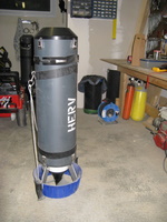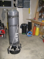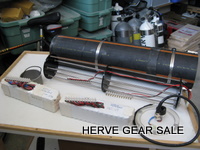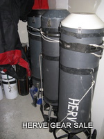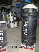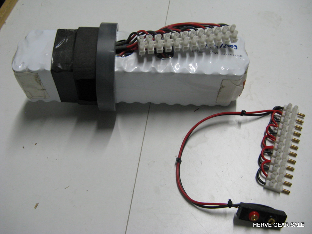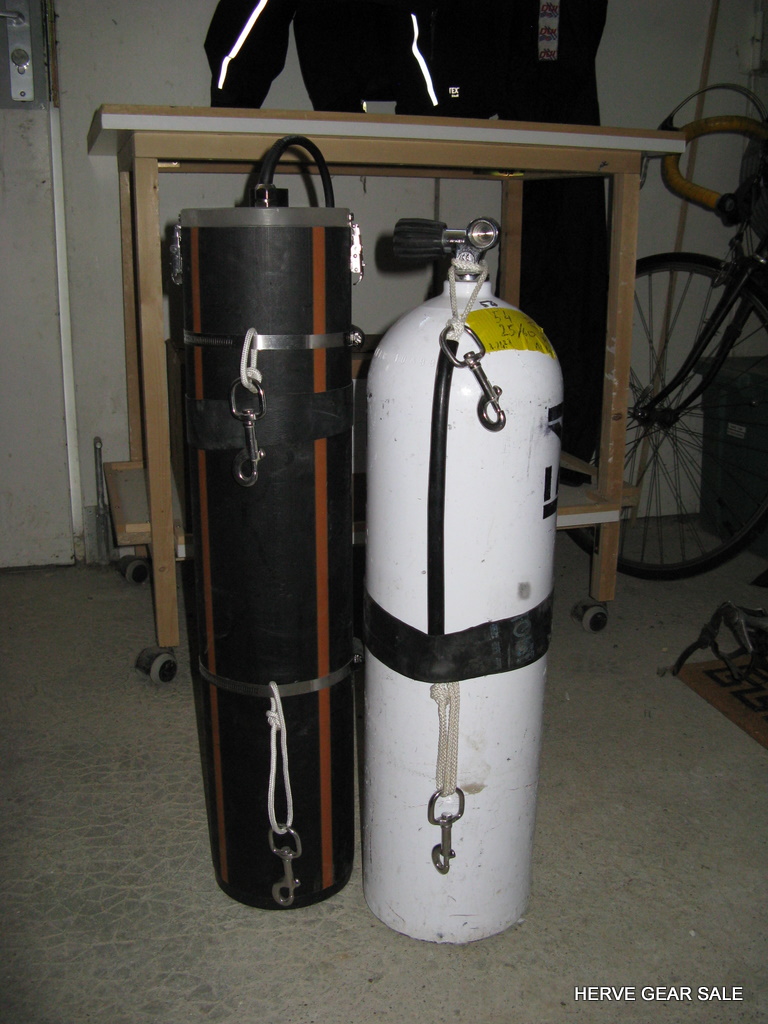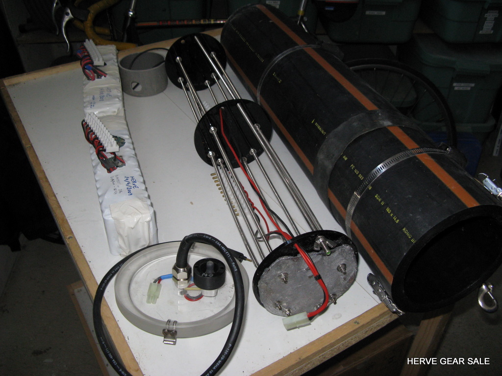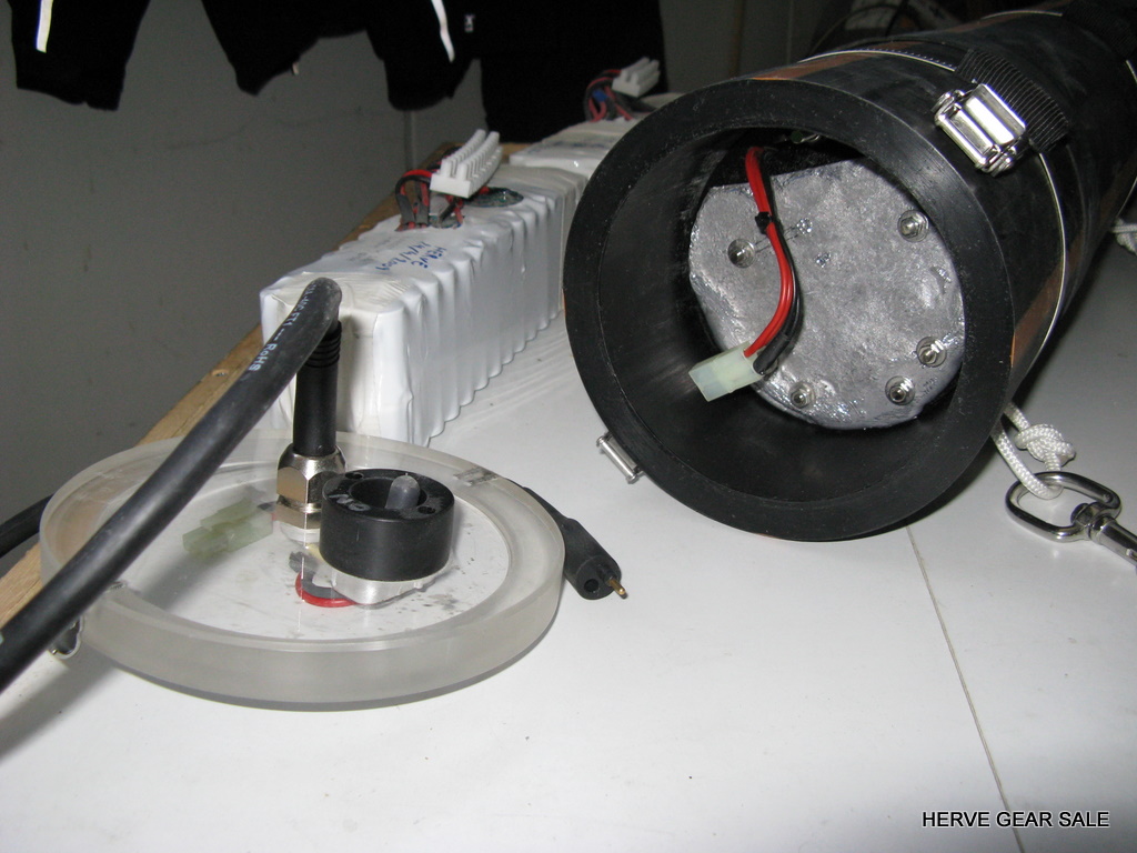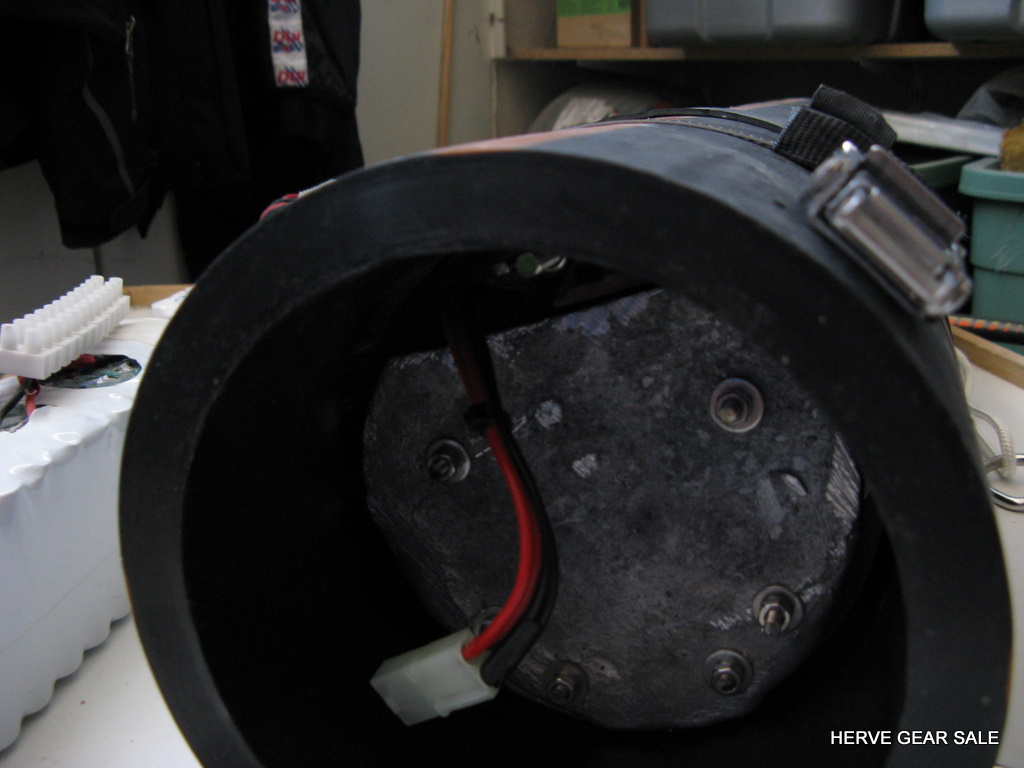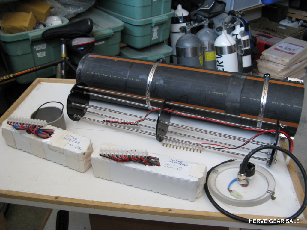 Heating tube AL80 size. (built early 2010) Contains 54 Ah of batteries NimH. (2 x 27 Ah light batteries) Made with 120 Sanyo cells of 4.5 Ah. Output: E/O connector. Inside tube diameter: 130 mm Neutral buoyancy (can be made negative if you remove lead) Charger not included Retail price: 1100 euros for a 13.5Ah only at http://www.deepstop.de/halcyon-explorer-canister-with-p-840.html Selling for 400 euros for 54 Ah. Pretty good deal (my cost was 950 euros) ! |