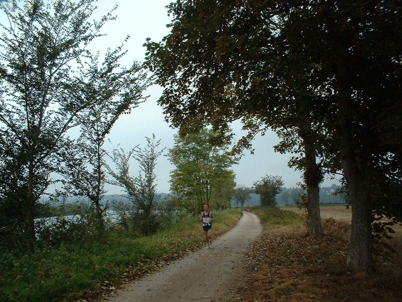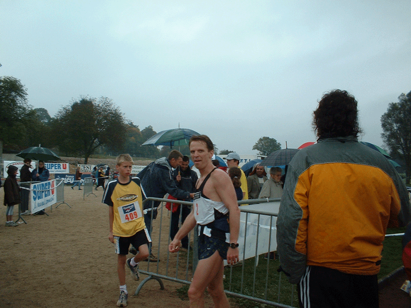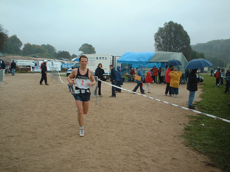 Despite all this, when I started the race I planned on a 4:30/K pace (7:14 min/ mile) and to see what happens. My hip muscle did not bother me (I did a nice 20 min warm up in warm clothes), neither did my bad foot (I was using an orthopedic sole). I started a little faster than planned (4:27 instead of 4:40 for the 1st 2 Ks). I felt good, doing small strides, trying to be as economic and relaxed as possible. The running course was very nice. We went through a little village and along the river Doubs. It was mostly very small country roads. Virtually no hills, just two bridges. For some reason after my 2 first Ks of warmup I could not get below 4:36. I made 2 mistakes: first I started running with somebody and chatted. I should have stayed by myself. He was not running fast enough. Second I had a glass of coke and ate too much in a short time (GU gel+Pain d'épice). My stomach never recovered. I could not eat anymore after that and felt like puking after K20. As I completed the first loop I knew that I was in trouble. I thought that maybe I should give up. But then I decided that I would finish the distance even if that meant walking and puking for 20 kilometers. At K25 I was having some serious muscle twitching in both hamstrings. I thought that I would either cramp or tear a muscle. It felt really bad. That is when I started doing some walking breaks. My legs were totally shot by K30. 12 Kilometers to go... I would start running like a snail for half a kilometer and walk some more. I thought that maybe I would get through this and start feeling a little better. I started getting really cold because I was not going fast enough to maintain enough body heat. At that point I had forgotten all about my big toe nail that had come loose at K15 and was traveling in my sock. That nail was only attached to the toe on its right edge at the start of the race; I had hurt it previously. Runners that were passing by encouraged