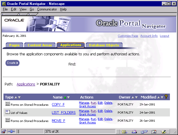 The first step is to create a place in Portal from which we can call our Copy and Move utility. There are several ways to do this in Portal. We chose to create an application with 2 forms. The first form is used to call the copy utility. The second form is used for the move utility. Each form captures values for two parameters required by our utilities: the source folder and the destination folder. Both forms also make use of a list-of-value module in order to facilitate folder selection for the user. All components are illustrated in Figure 2.