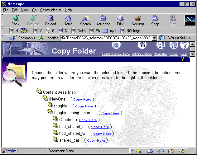 In Listing B, lines 61 to 65 are a little puzzling and deserve a detailed explanation. They are a workaround a feature of the Portal 3.0.6. API. It turns out that the API wwv_cornerdb.copy procedure requires the name of the folder copy to be different from the name of the original folder in only one case: when you choose the root folder level (ID=1) of a content area for the destination. This is the error that Portal will report if that rule is violated: