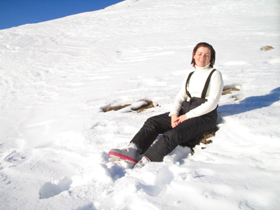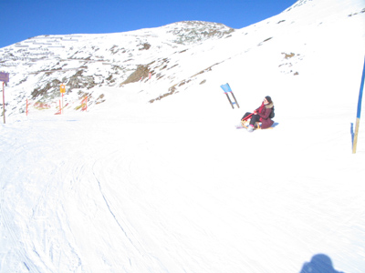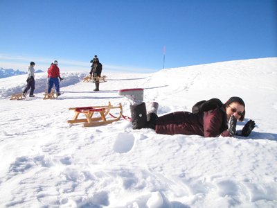 sur sa luge ;-); moi je me suis vautrée dans la neige avec un