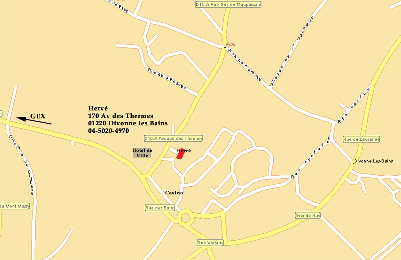 From Gex, head towards Divonne. As you get close you will see "le Chateau de Divonne" on your right-hand-side and an 18-hole Golf course on your right hand side. As soon as you enter the town you need to make a left turn on the street where I live: Av. des Thermes. It starts on a little bridge: it is the first left turn when you reach Divonne. If you miss it you will get to a roundabout just 100 yards further down. When you are on Av. des Thermes drive only 150 meters and look on your right. You will see a building with wood colored decorations on its roof. That is the residence where I live. If you look carefully you might see a small street number "170" on the left hand side of the entrance. Park right there and look for me. I live in the closest apartment to the entrance on the right hand side. Apt #7. | ||