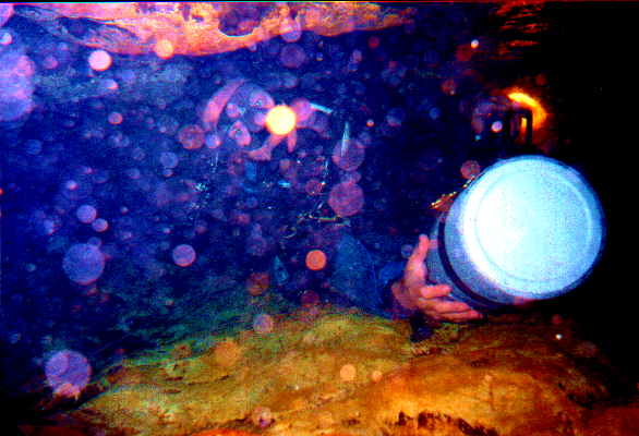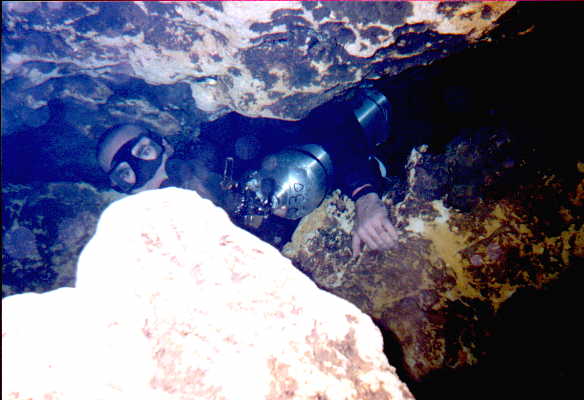 These pictures were taken in Ichetucknee State Park, in Jug Hole on Sun, April 5th 1998. First picture: that's me pushing a tank into the bedding plane restriction at 60 feet depth, on the way out. Second picture: that's Layson getting through the Diamond restriction at 95 feet depth. I went through first, set myself in a good position for a picture and then he came.
